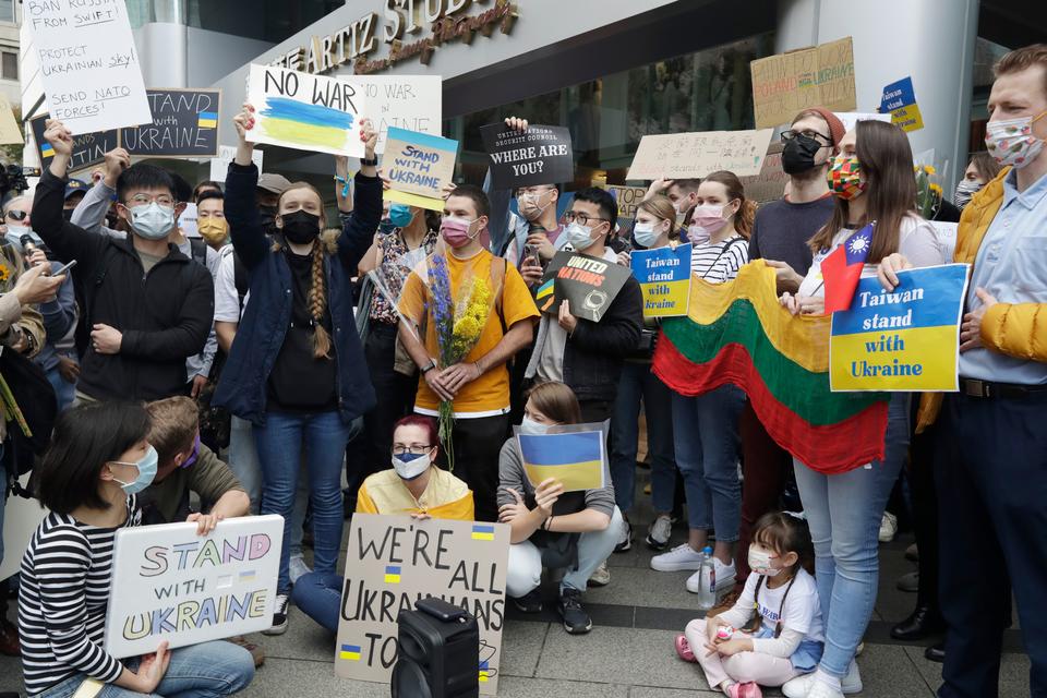 На Тайвані десятки членів слов'янської громади зібралися в п'ятницю на розі вулиць міста Тайбей, щоб показати солідарність з Україною.