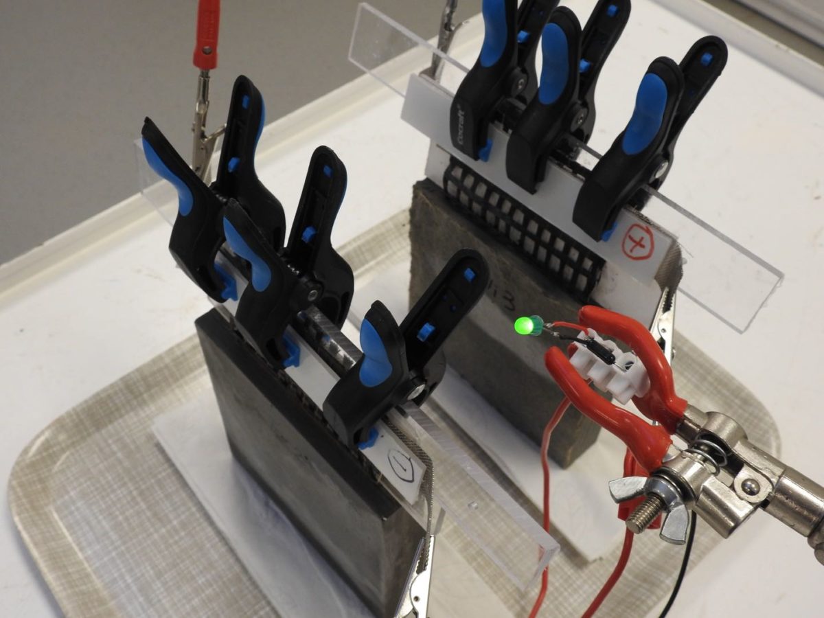 Система зберігання складається з суміші на основі цементу, в яку була закладена наявна в продажу сітка з вуглецевого волокна (CF) з металевим покриттям. Як анод використовувалося залізо (Fe), а в якості катода — оксиди на основі нікелю (Ni).