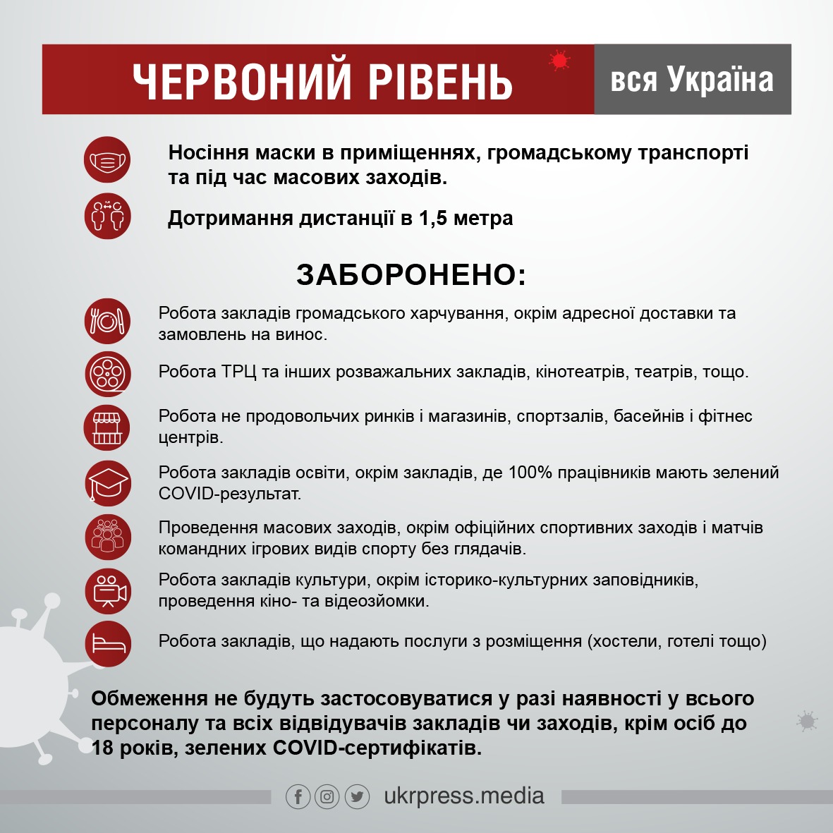 - Заборонене проведення масових заходів, крім офіційних спортивних заходів та матчів командних ігрових видів спорту без глядачів. Заборона не застосовується, якщо все організатори та відвідувачі мають зелений COVID-сертифікат.