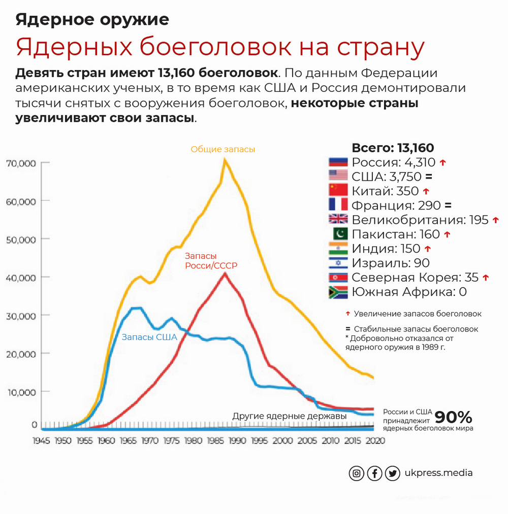 На пике в 1986 году у двух соперников было почти 65 тысяч ядерных боеголовок, что сделало гонку ядерных вооружений одним из самых угрожающих событий холодной войны. Хотя Россия и США демонтировали тысячи боеголовок, считается, что несколько стран увеличивают свои запасы, в первую очередь Китай.