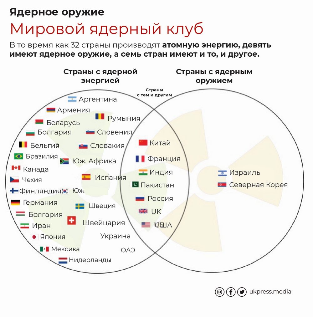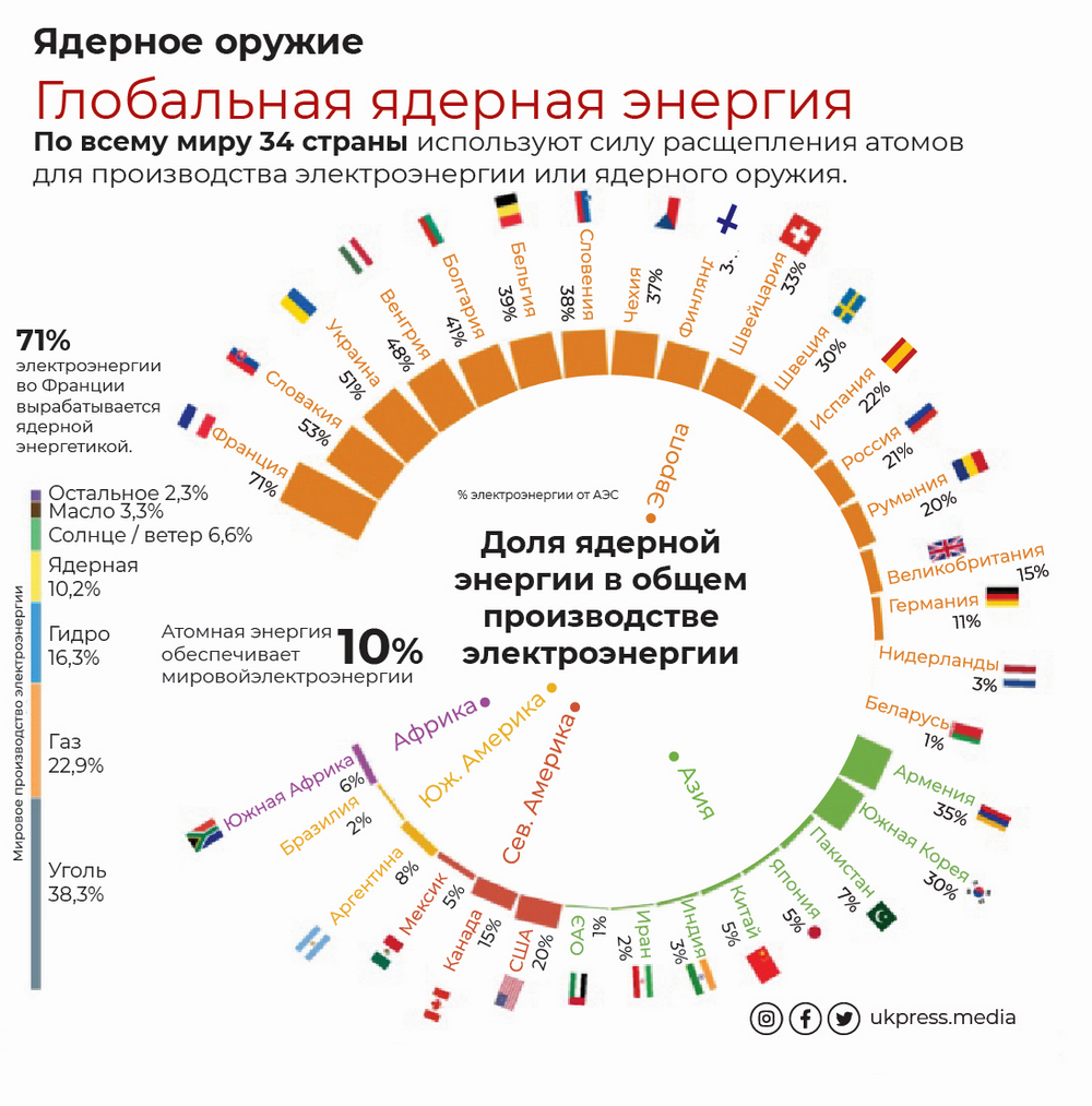 32 страны генерируют атомную энергетику, 9 стран имеют ядерное оружие.