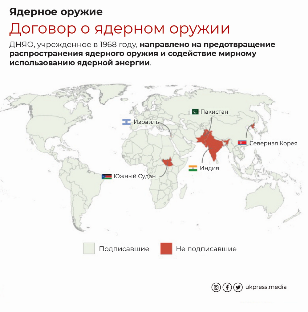 В настоящее время к договору подписано около 190 стран, и только Индия, Израиль, Пакистан и Южный Судан никогда не участвовали в нем. Северная Корея подписала договор в 1985 году, но вышла из него в 2003 году. Три года спустя, под руководством Ким Чен Ира страна взорвала свое первое ядерное оружие.