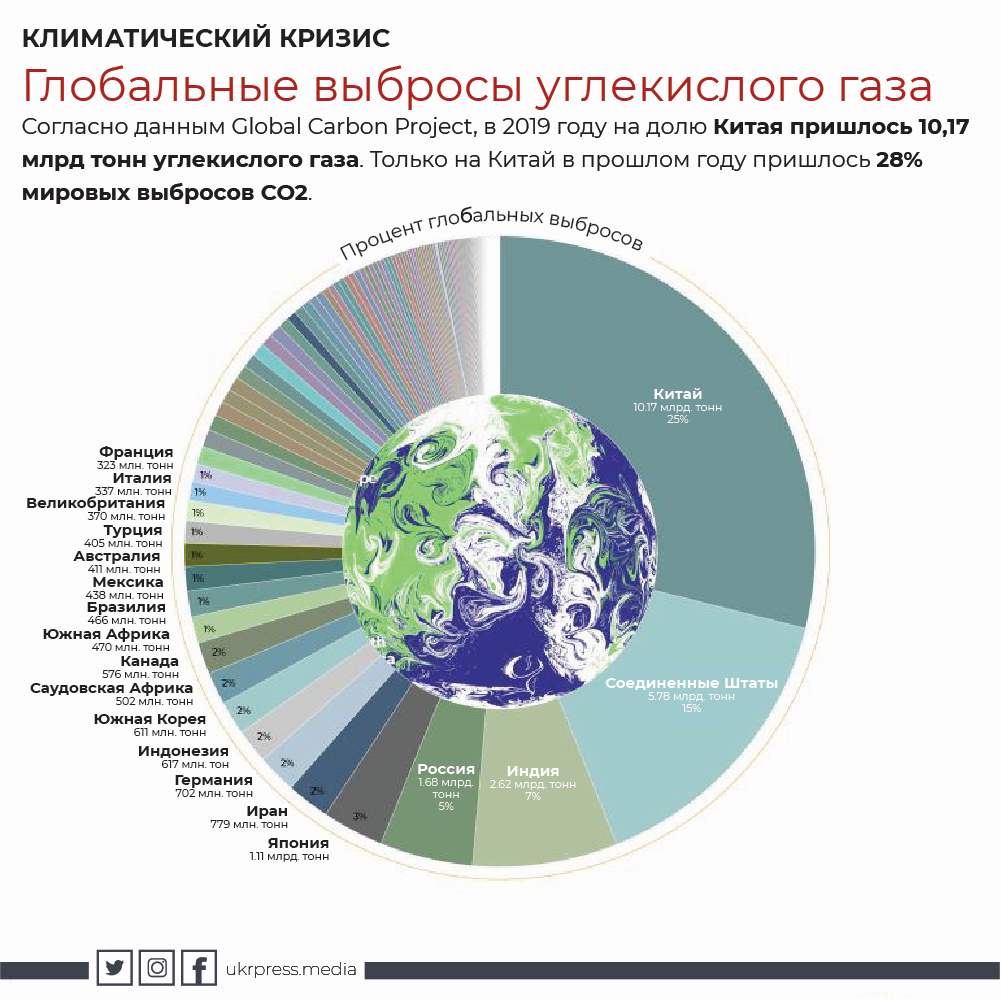 Согласно данным Global Carbon Project, в 2019 году на долю Китая пришлось 10,17 млрд тонн углекислого газа. Только на Китай в прошлом году пришлось 28% мировых выбросов CO2.