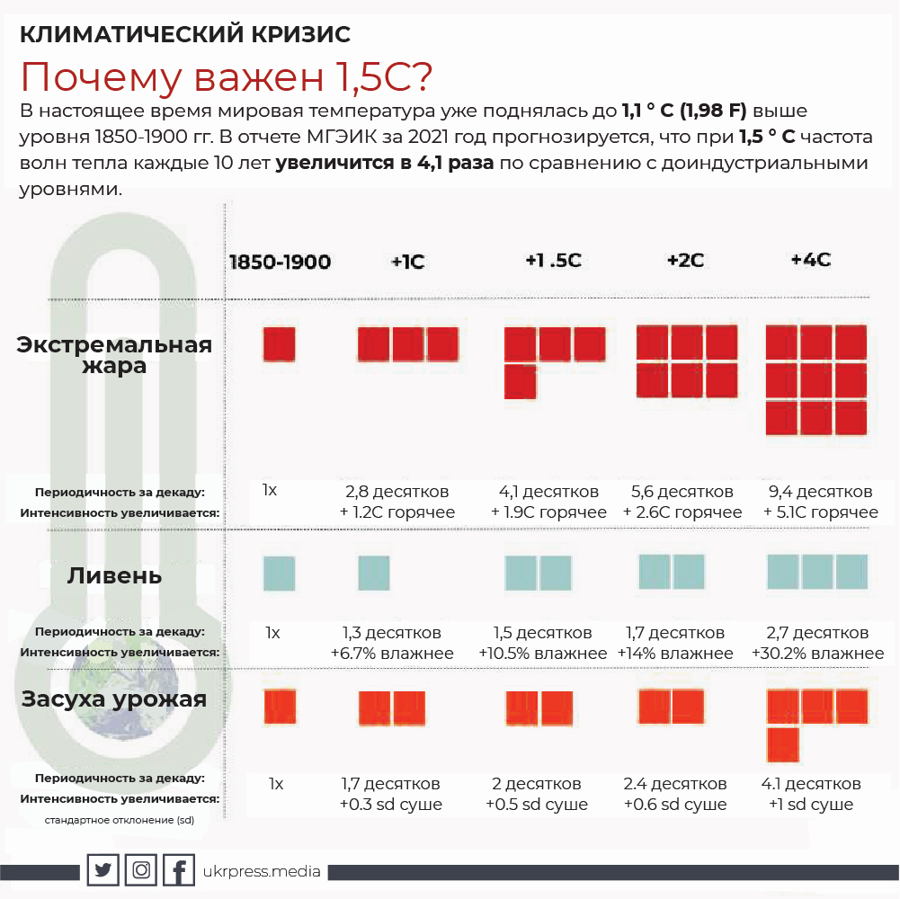 В настоящее время мировая температура уже поднялась до 1,1°C (1,98F) выше уровня 1850-1900 гг. В отчете МГЭИК за 2021 год прогнозируется, что при 1,5°C частота волн тепла каждые 10 лет увеличится в 4,1 раза по сравнению с доиндустриальными уровнями.