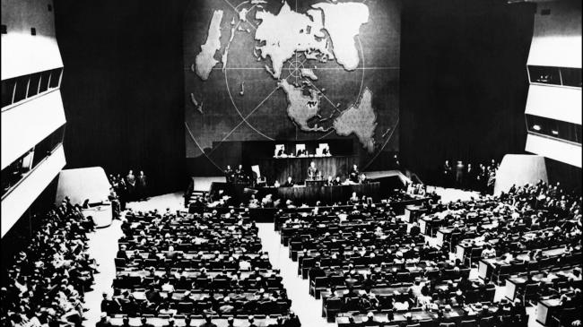 Год спустя, в начале 1947 года, британское правительство объявило о своем решении передать бедствие, которое оно создало в Палестине, ООН и прекратить действие ее мандата. 29 ноября 1947 года, вопреки воле палестинского народа, Генеральная Ассамблея ООН в Нью-Йорке проголосовала за раздел Палестины, приняв Резолюцию 181. Она рекомендовала разделить Палестину на еврейское и арабское государства.