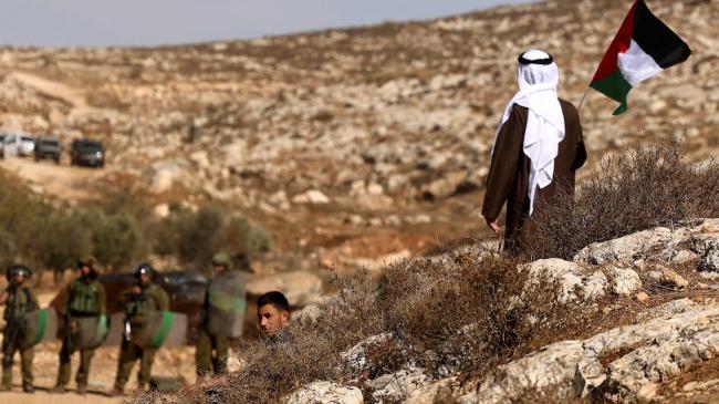 Палестинский демонстрант поднимает национальный флаг перед силами безопасности Израиля во время демонстрации против создания израильских застав на палестинских землях в Бейт-…