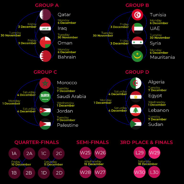Четыре победителя встретятся в полуфинале, финал состоится 18 декабря, в национальный день Катара.