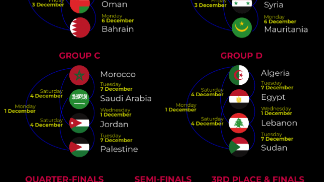 Тунис сразится с Мавританией в первом матче турнира с Ираком, самой успешной командой в соревновании с четырьмя титулами, сравнявшись с Оманом во втором матче.