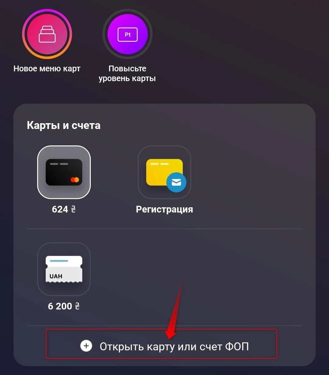Дальше нужно нажать кнопку с "плюсиком" внизу – "Открыть карту или счёт ФОП".