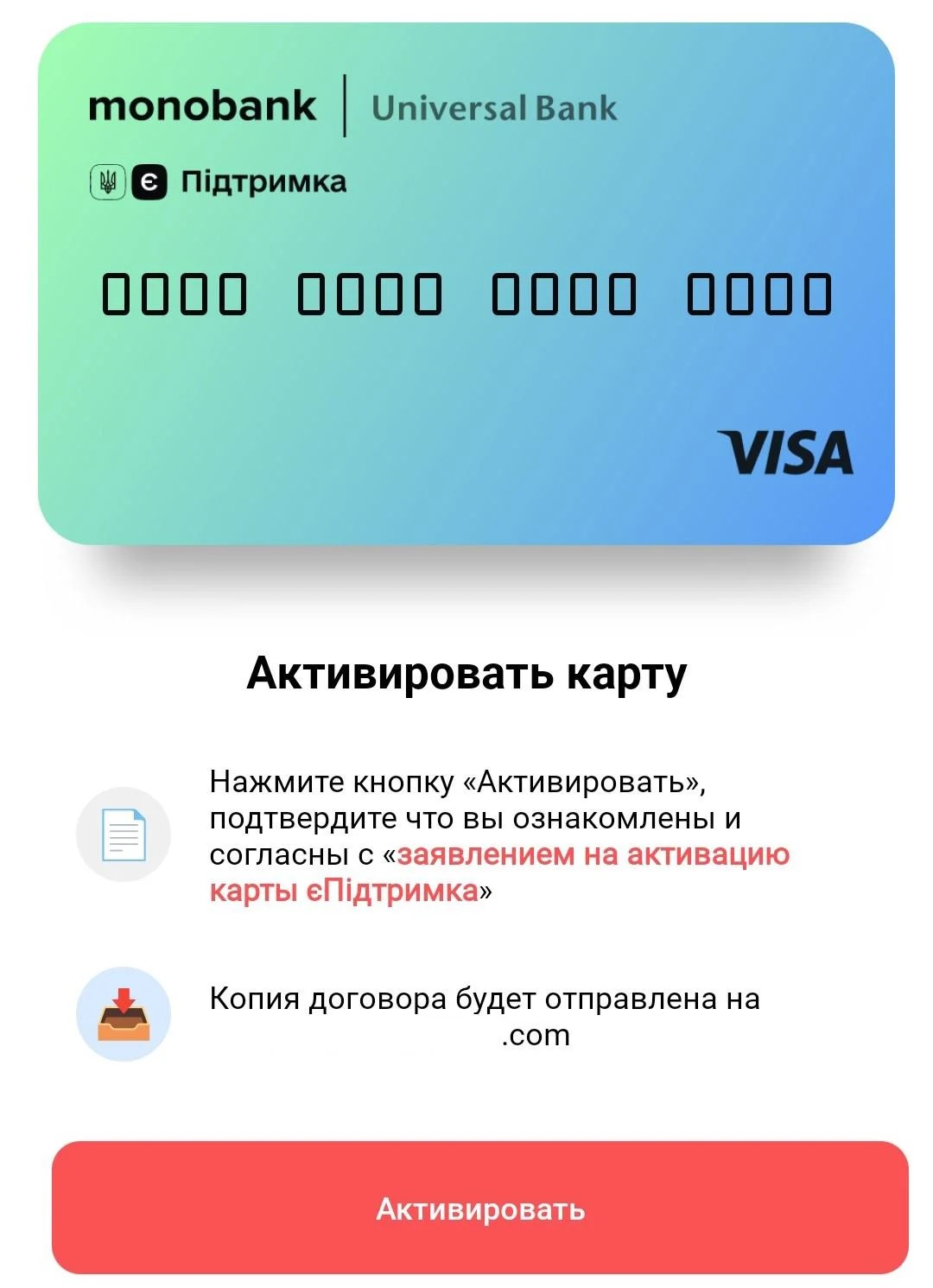 Приложение покажет новый экран с кнопкой "Активировать" и сообщением, на какой электронный адрес будет отправлена копия договора на оформление карты.