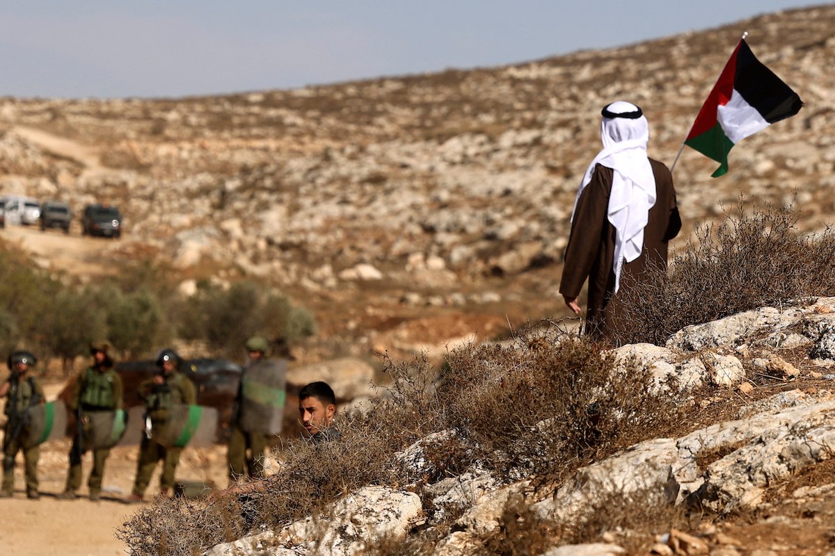 Палестинский демонстрант поднимает национальный флаг перед силами безопасности Израиля во время демонстрации против создания израильских застав на палестинских землях в Бейт-Даджане, к востоку от Наблуса на оккупированном Западном берегу, 12 ноября 2021 года. Палестинский демонстрант поднимает национальный флаг, стоя лицом к силам безопасности Израиля, во время демонстрации против создания израильских застав на палестинских землях, в Бейт-Даджане, к востоку от Наблуса на оккупированном Западном берегу, 12 ноября 2021 года.