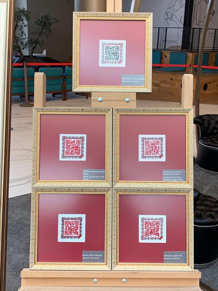 Как сообщает Посольство Украины в Турецкой Республике, на выставке Украина была достойно представлена уникальной вышитой картой Украины, которая создавалась группой этнографов и мастеров вышивки при координации жены бывшего Посла Украины в Турции Татьяны Сибиги, а также коллекцией вышитых QR-кодов, созданных в рамках международного художественного проекта «GLOW ART» Татьяной Протчевой.