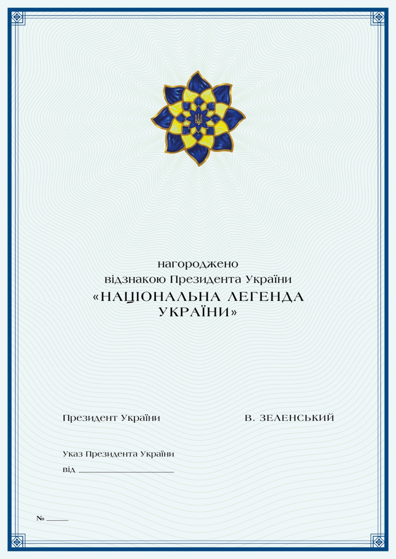 Президент Владимир Зеленский утвердил положение о новой государственной награде, подписав Указ № 362/2021 «Об отличии Президента Украины «Национальная легенда Украины». Глава государства также утвердил эскизы — рисунок этой награды и рисунок образца бланка диплома к нему.