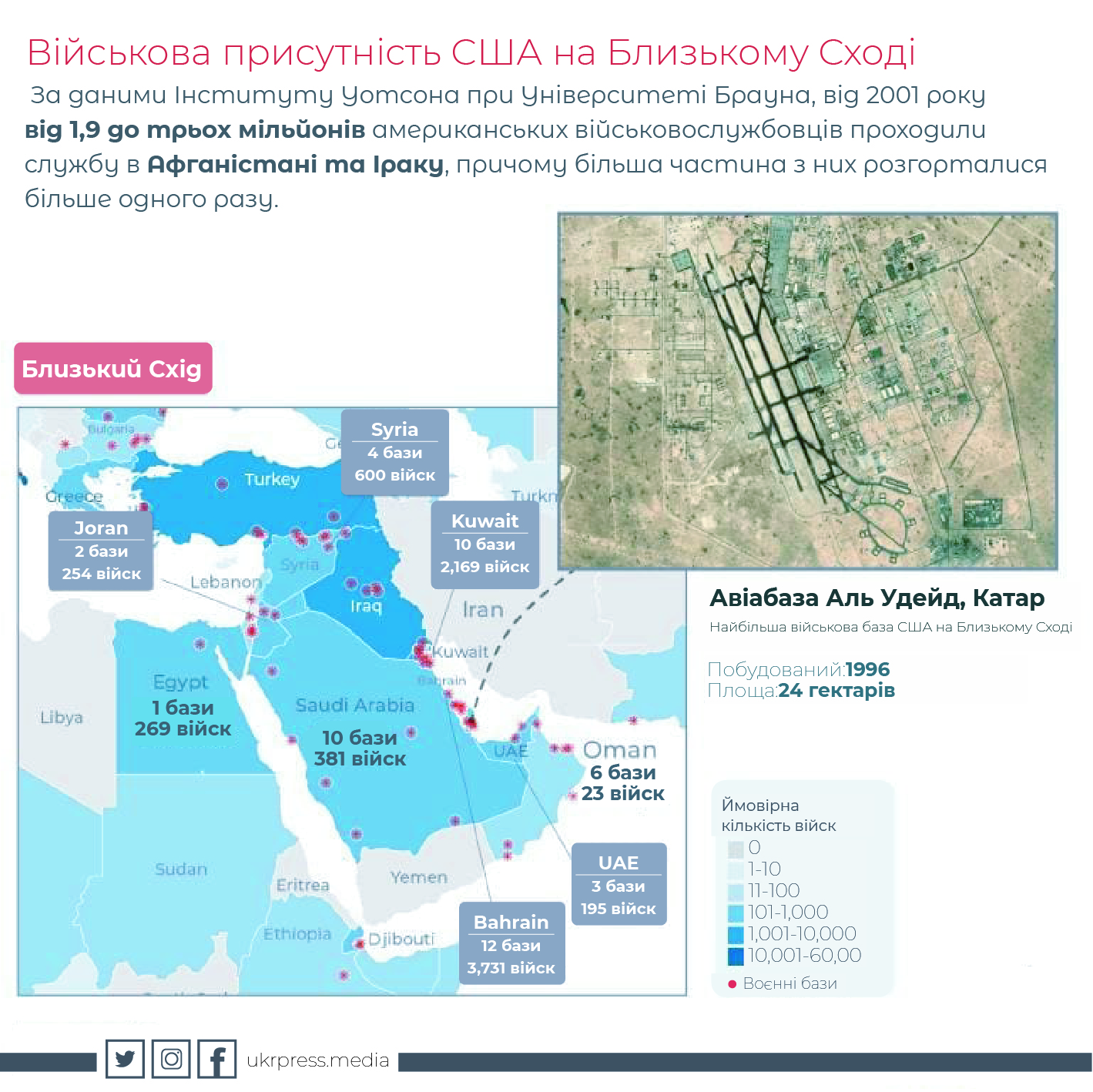 Найбільшим військовим об’єктом США на Близькому Сході є авіабаза Аль-Удейд, розташована на захід від Дохи, Катар. Заснована у 1996 році, вона приймає близько 11 тисяч американських співробітників та службовців коаліції. База займає площу 24 гектари (60 гектарів), на базі розміщено майже 100 літаків, а також безпілотників.