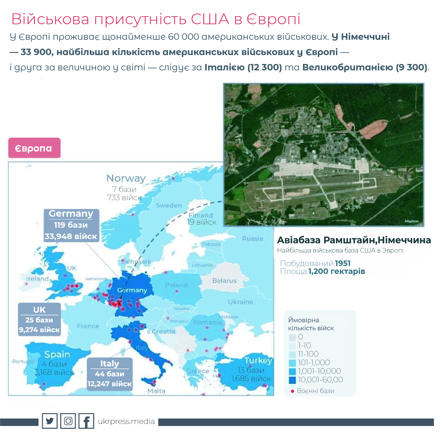 У Європі проживає щонайменше 60 000 американських військових. У Німеччині — 33 900, найбільша кількість американських військових у Європі — і друга за величиною у світі — слідує за Італією (12 300) та Великобританією (9 300). Однак кількість американських військ, розміщених у Німеччині, зменшилася більш ніж удвічі між 2006 та 2020 роками, скоротившись з 72 400 до 33 900.