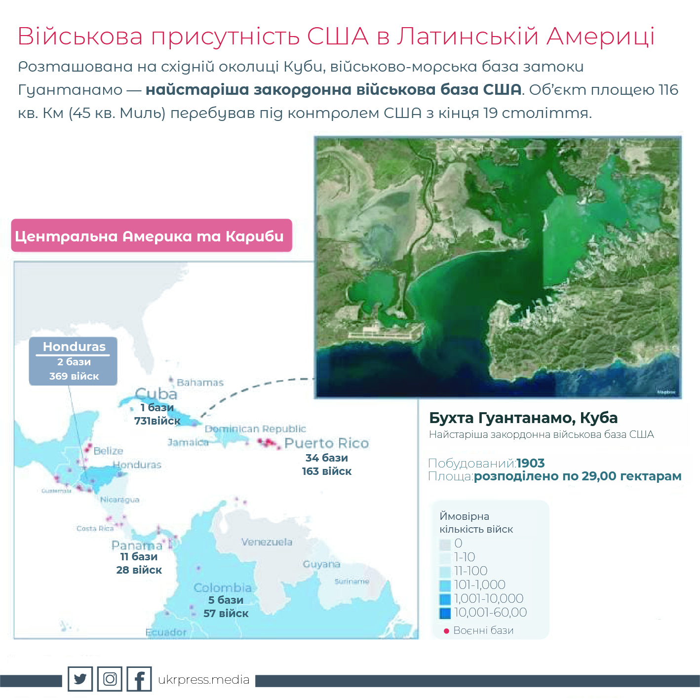 Розташована на східній околиці Куби, військово-морська база затоки Гуантанамо — найстаріша закордонна військова база США. Об’єкт площею 116 кв. Км (45 кв. Миль) перебував під контролем США з кінця 19 століття.