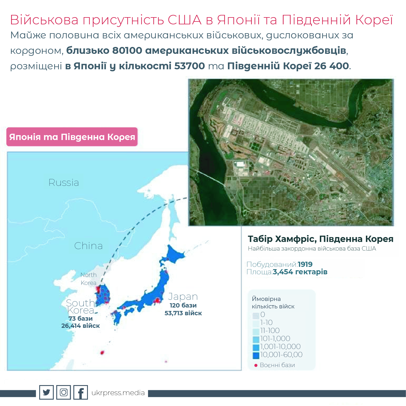Майже половина всіх американських військових, дислокованих за кордоном, близько 80100 американських військовослужбовців, розміщені в Японії у кількості 53700 та Південній Кореї 26 400.