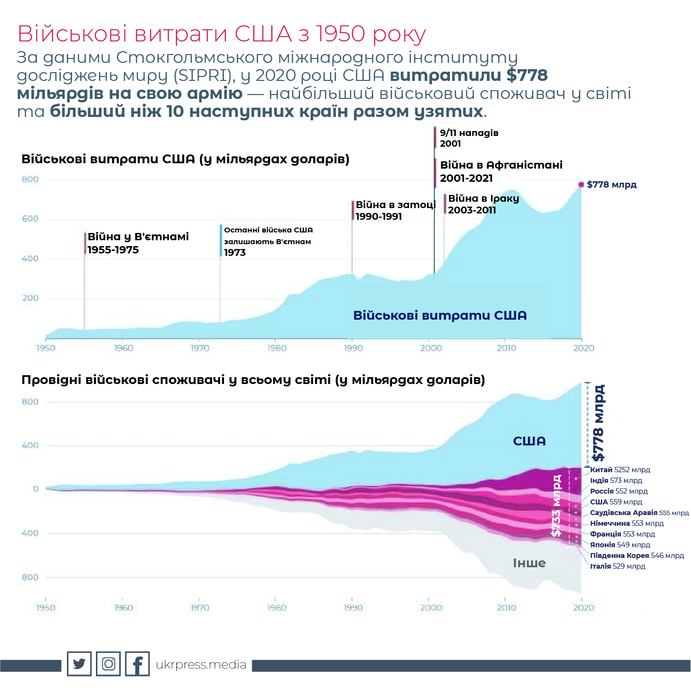 За даними Стокгольмського міжнародного інституту досліджень миру (SIPRI), у 2020 році США витратили $778 мільярдів на свою армію — найбільший військовий споживач у світі та більший ніж 10 наступних країн разом узятих.
