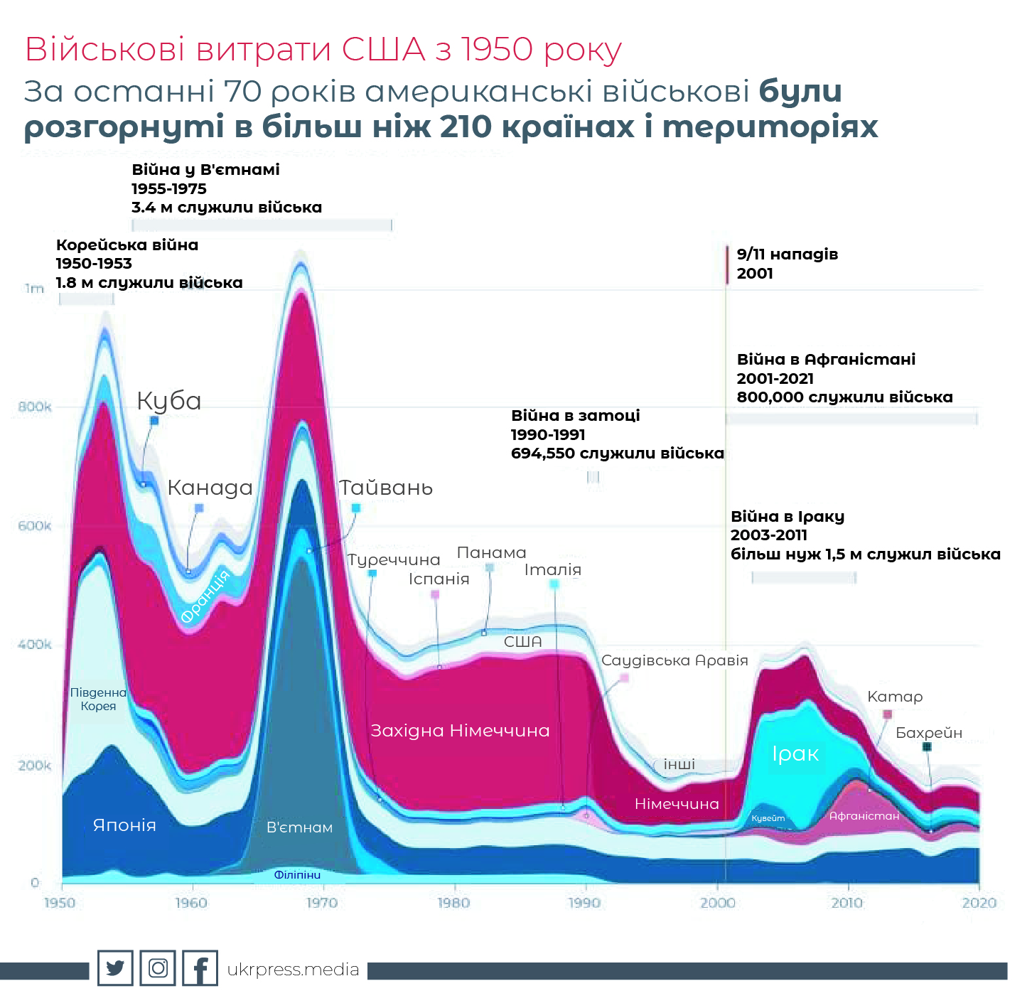 За останні 70 років американські військові були розгорнуті в більш ніж 200 країнах і територіях.