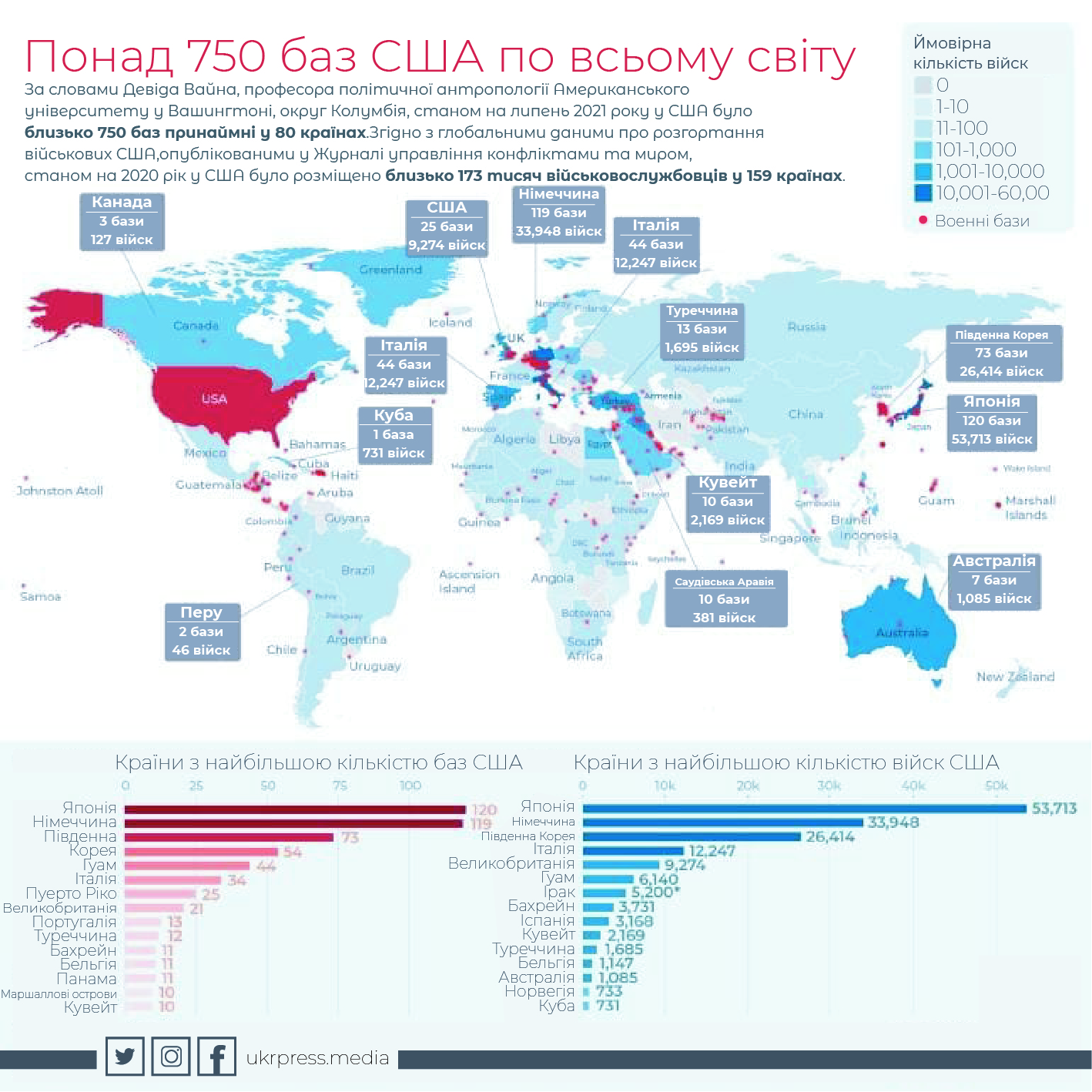 За словами Девіда Вайна, професора політичної антропології Американського університету у Вашингтоні, округ Колумбія, станом на липень 2021 року у США було близько 750 баз принаймні у 80 країнах.